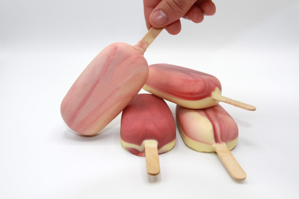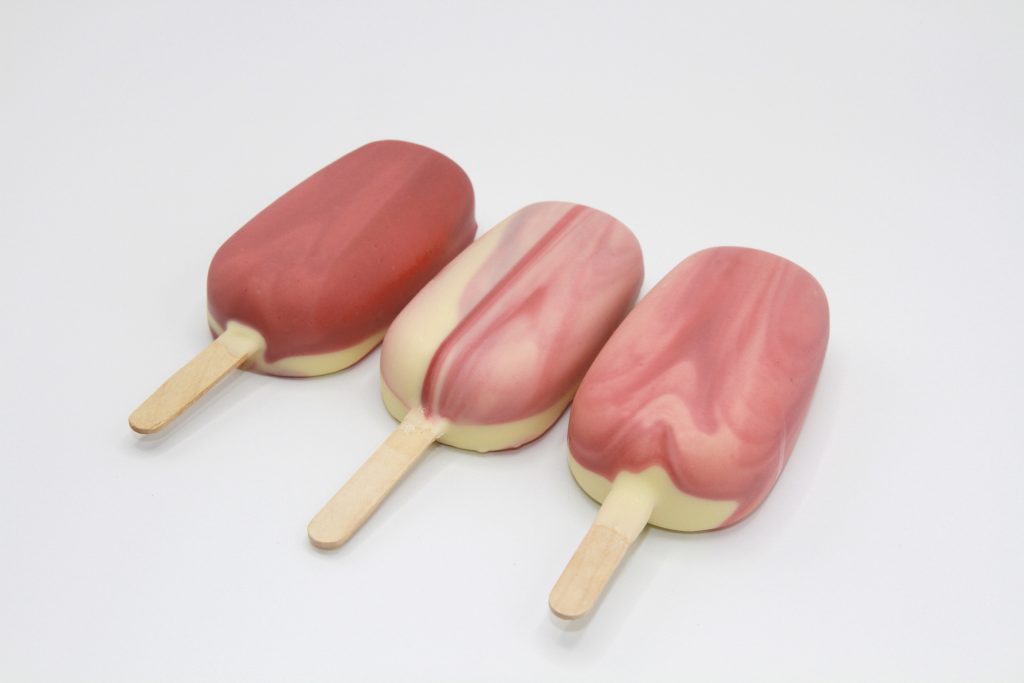 En este artículo se presenta una aplicación práctica del marmoleado bicolor utilizando chocolate blanco Opalys 33% y cobertura de frambuesa, junto con la formulación completa del helado base y los baños necesarios para su ejecución.